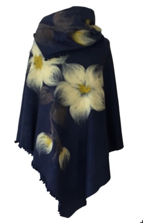 Půvabné měkké pončo z pleteniny zdobené květinovými vzory - vytvořené tzv. suchým filcováním.