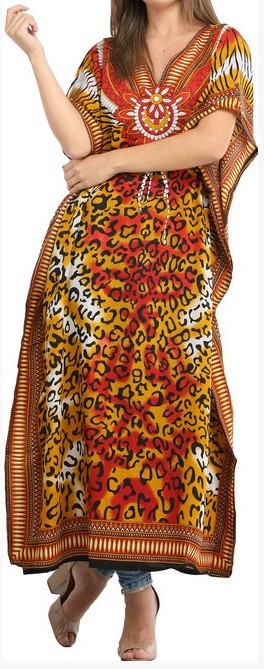 Kaftanové dlouhé šaty zdobené potiskem, vepředu výstřih do V, rovný střih, plná záda, nad pasem na stažení šňůrkou.