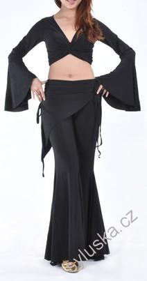 Praktický taneční komplet - kalhoty, se zvonovými nohavicemi. Součástí kalhot je šátek. Zavazovací top s 3/4 volánovými rukávy, plná záda, možno vázat více způsoby.