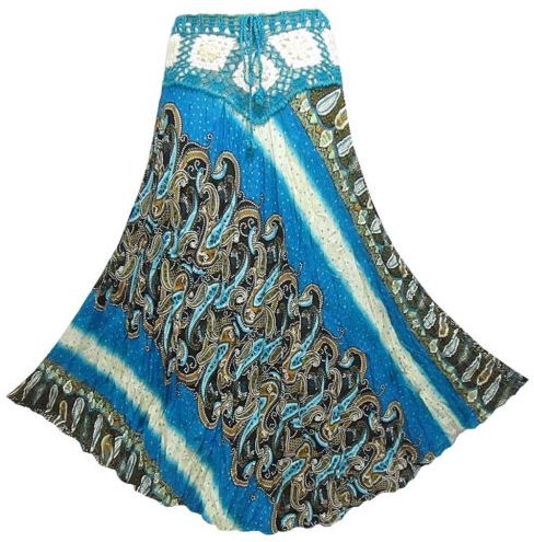 Delší sukně zdobená potiskem, v pase elegantní, ručně háčkovaná krajka, možno dotáhnout šňůrkou. Střih mírně do Áčka.