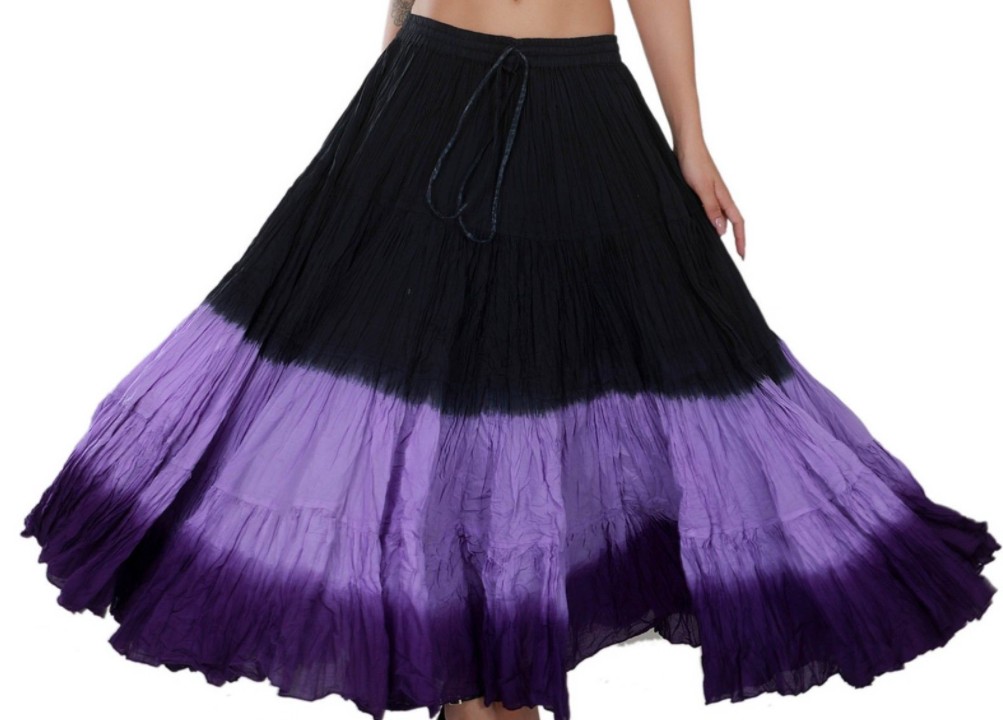 Široká bavlněná kolová taneční sukně, složená z volánových dílů. Elastický pas.