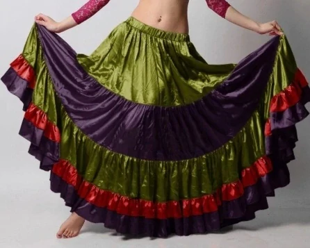 Tato profesionální široká kolová tribal sukně je ideální volbou pro tanečnice, které hledají výrazný, pohyblivý a elegantní prvek šatníku. Sukně je ušitá z kvalitního indického saténu (polyester), který krásně odráží světlo a dodává tanci dynamiku. Pět bohatých volánů vytváří efektní objem a výrazný pohyb při točení, chůzi i choreografiích.