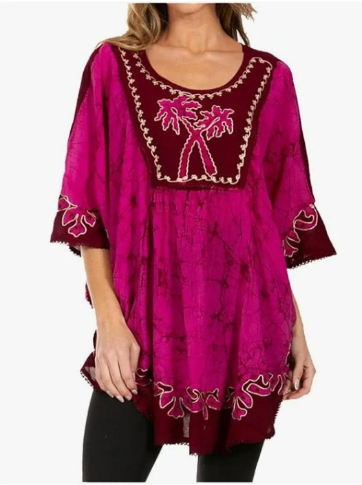Půvabná batikovaná blůzka kaftanového stylu se vzory palmiček, zdobená výšivkou, krajkou, volné rukávky. Ideální pro horké letní dny.