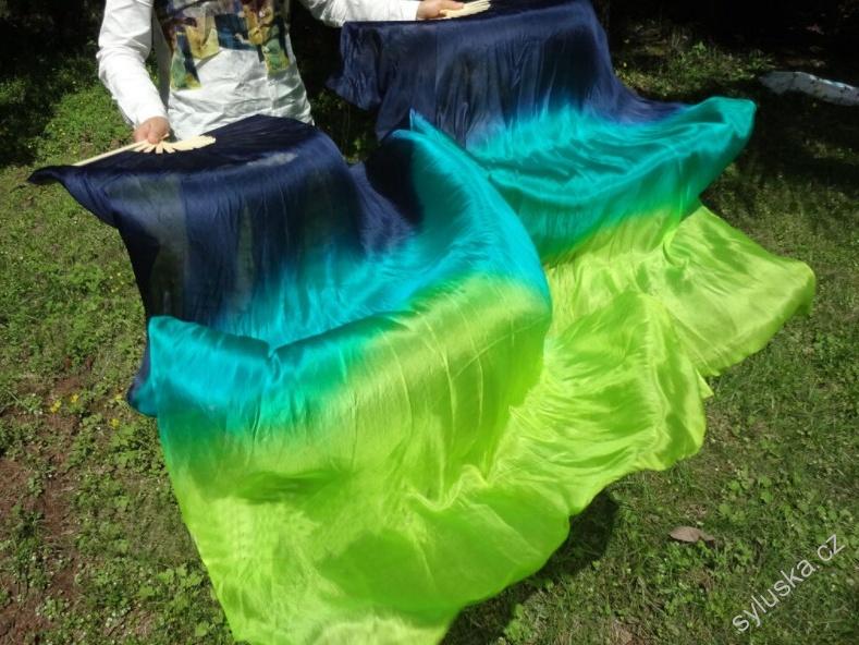 Vějíře hedvábné 1.5m - MODRÁ-PAVÍ ZELENÁ-ŽLUTOZELENÁ