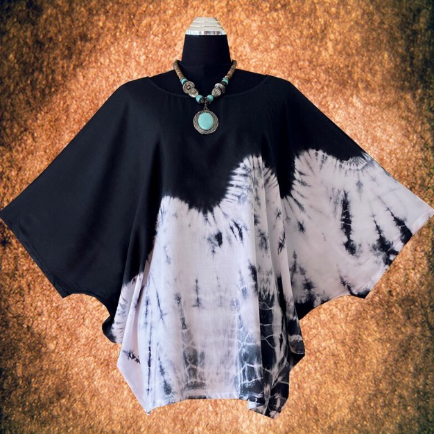 Půvabná batikovaná blůzka kaftanového stylu se širokými rukávy.