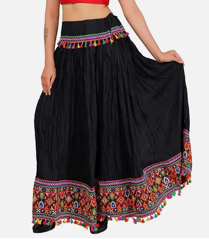 Tradiční etnická Kuchi indická dlouhá sukně. Zdobená barevnými třásněmi a bohatou výšivkou. Sukně je elastická, dotažení na šňůrku.
