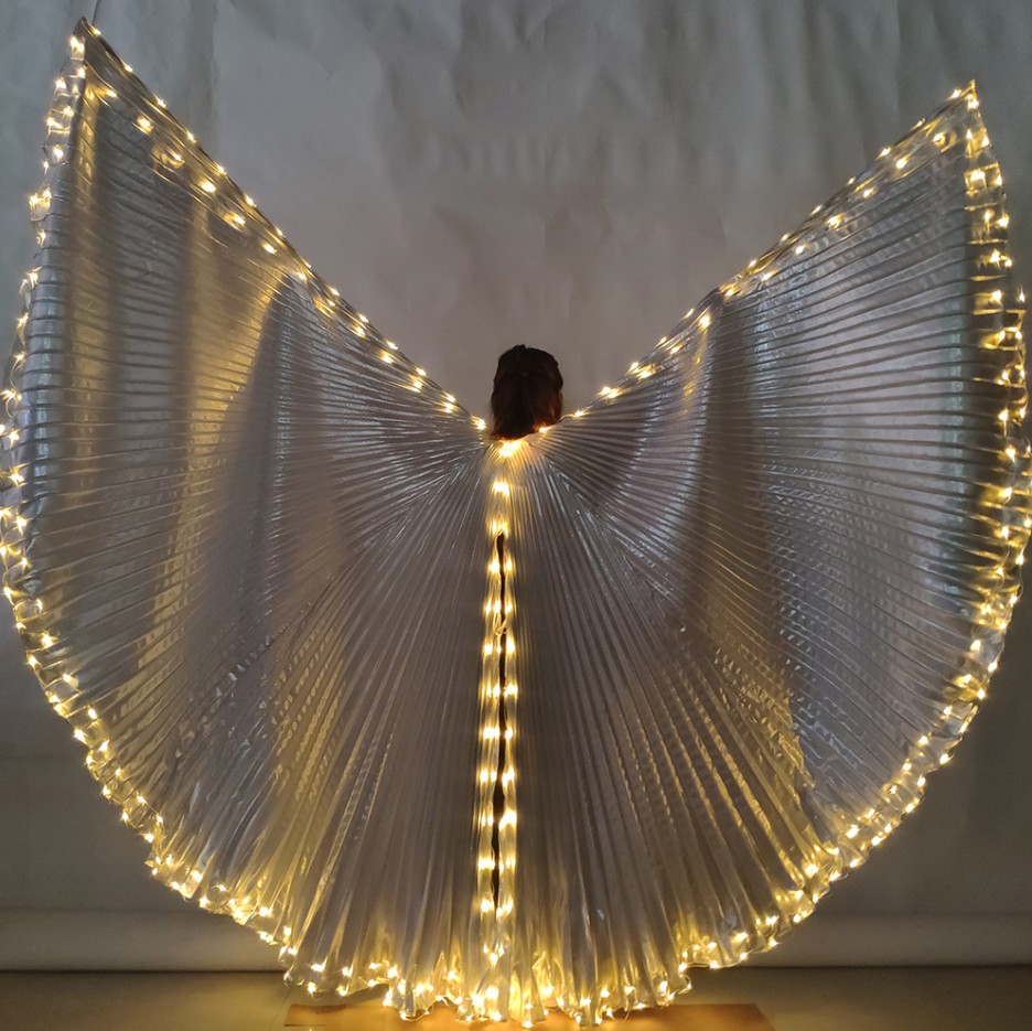 Belly dance ISIS stříbrná křídla opatřená svítícími žlutými LED diodami po obvodu.